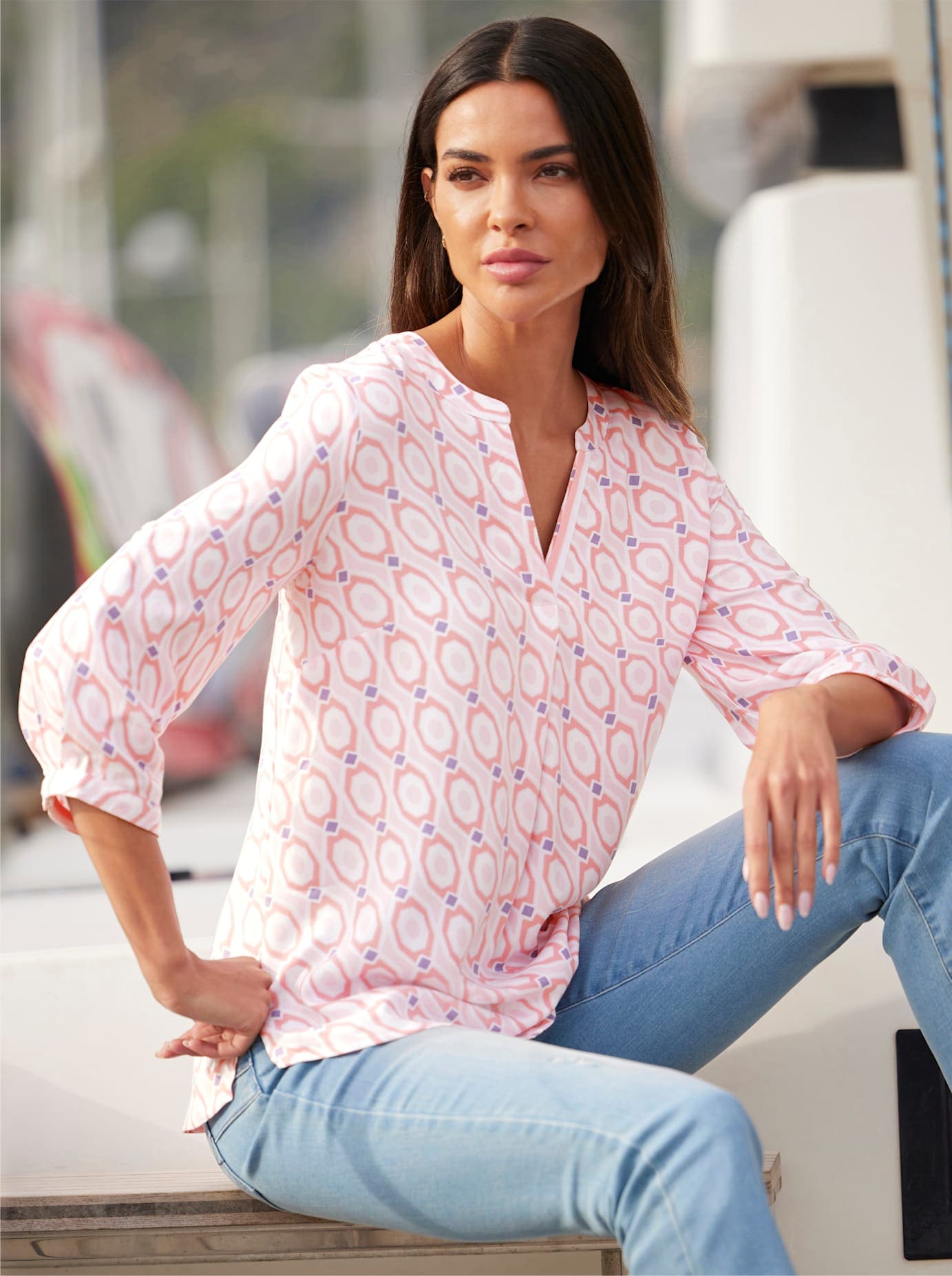 2-in-1-Bluse Top gestylt im Lagen-Look, mit leicht transparenten Netzeinsätzen und Zierknopfleiste vorn. Mit Rundhals-Ausschnitt, im Nacken zu knöpfen, und 3/4 Arm. Pflegeleichte, knitterarme Koffer-Qualität. 100% Polyester. Besatz: 100% Polyester. Maschinenwäsche.