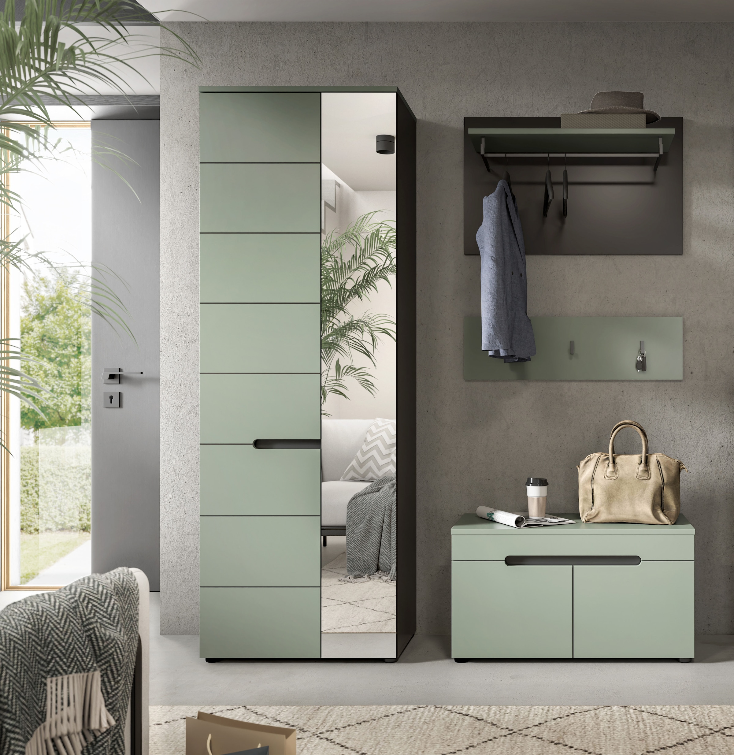 Set beinhaltet | 1x Sitzbank, 1x Paneel, 1x Schuhkommode, 1x Spiegel |