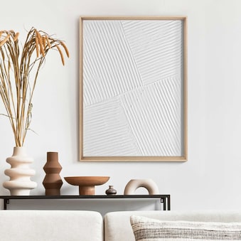 Handgefertigter Wanddeko mit abstraktem Relief in weissem Gips, eingerahmt von einem rahmen. Der skandinavische Minimalismus mit 3d-Textur passt zu den meisten modernen Wohnstilen wie Basic, Vintage, Urban oder Industrial.