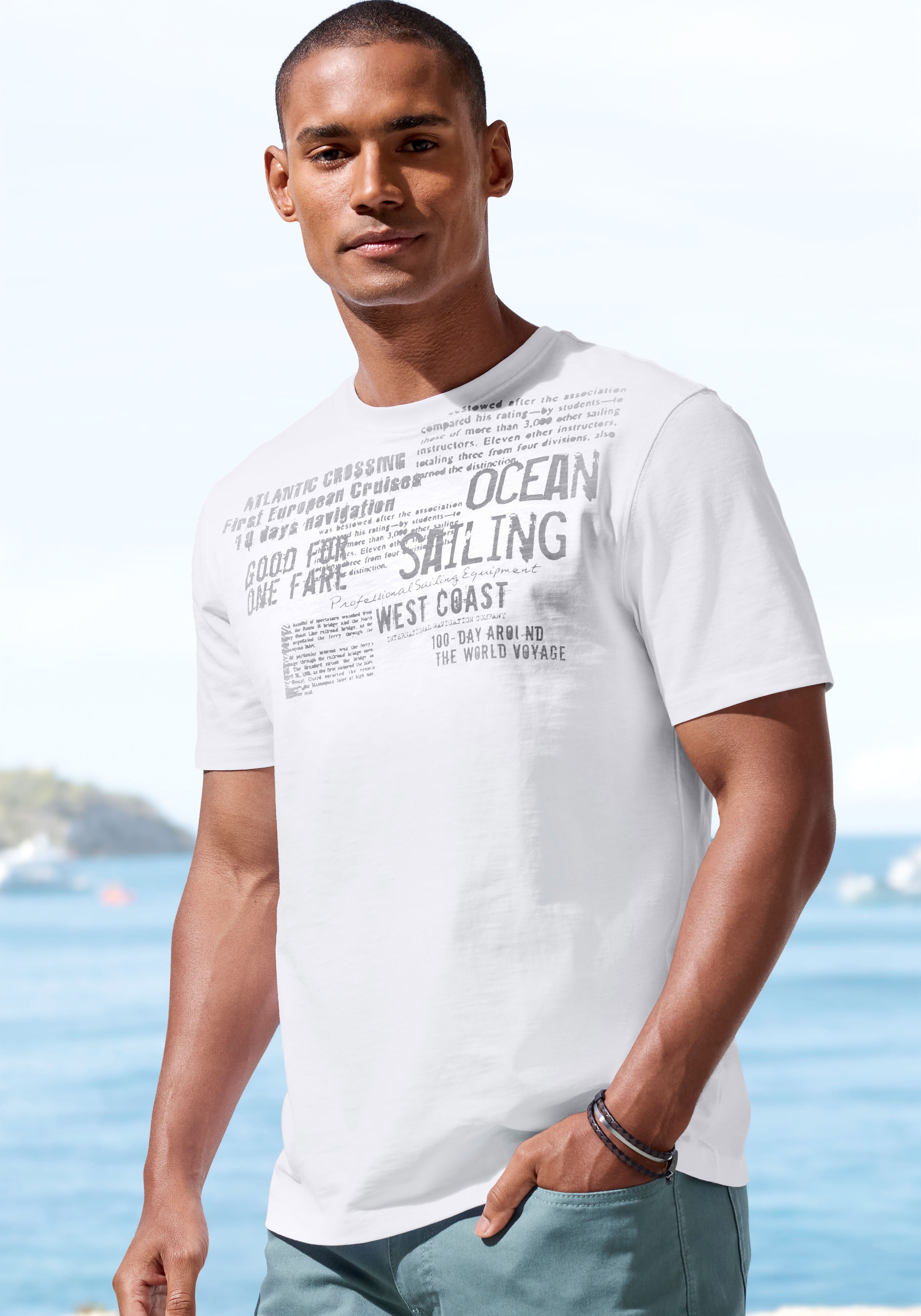 Sommerliches T-Shirt von John Devin mit platziertem Print vorn. Rundhalsausschnitt. Normale Passform. Ideal zu langen Hosen oder Jeansshorts. Slub-Qualität aus reiner Baumwolle.