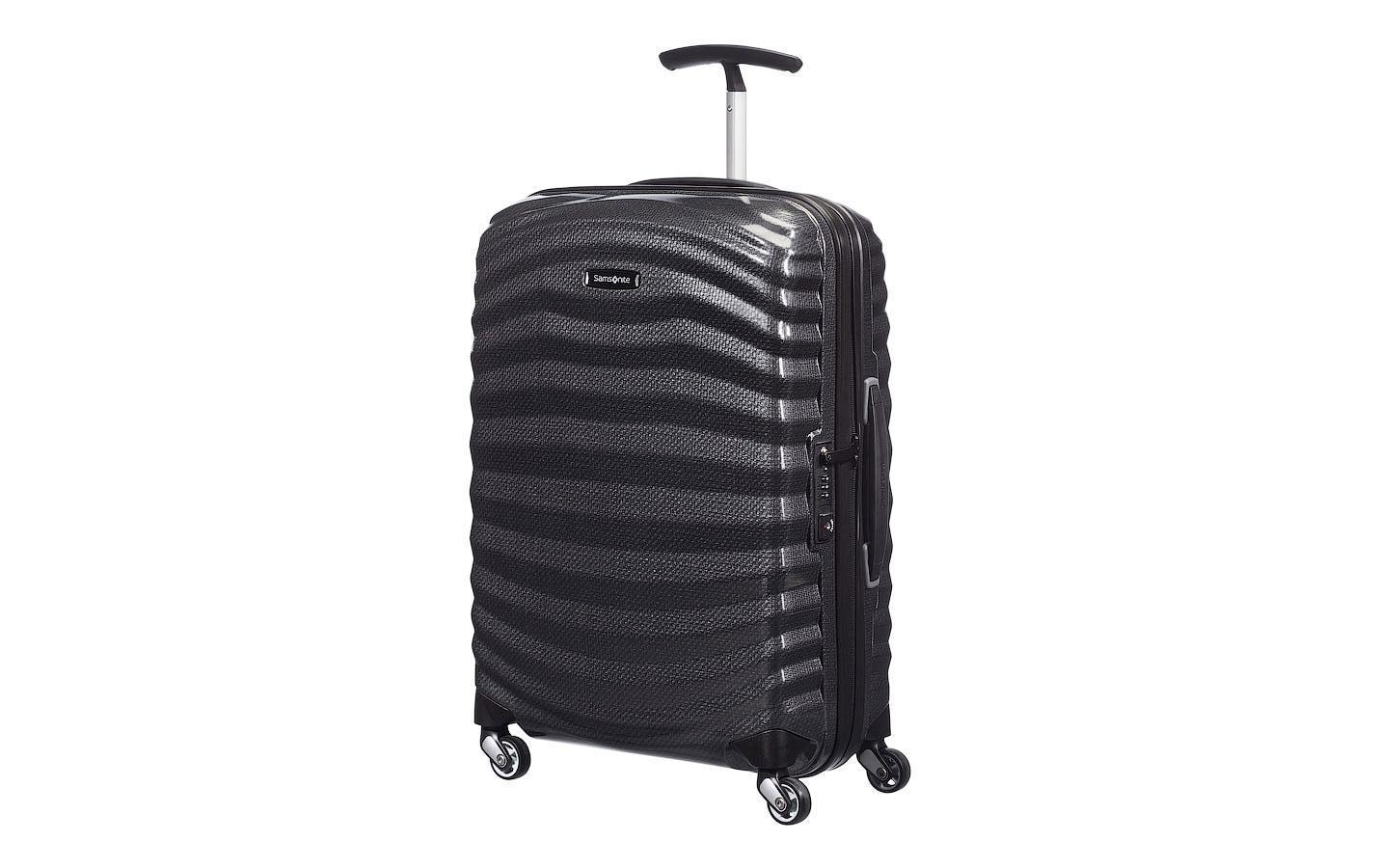 Samsonite Reisekoffer Lite Shock Spinner. 2 Fächer mit guter Innenausstattung, Packriemen und Taschen. 4 Rollen und einteilige Teleskopstange für leichte Manövrierbarkeit. Hergestellt aus leichtem, stossfestem Curv-Material. Integriertes One-Slot-TSA-Schloss für sicheres Reisen in die USA.