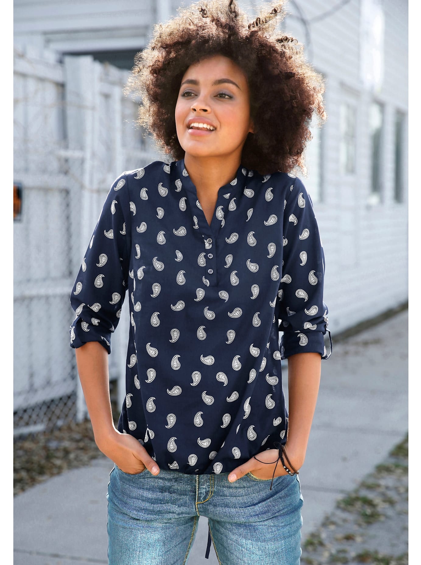 Bei dieser Druckbluse wissen wir gar nicht, was uns besser gefällt: das gefährlich schöne Animal-Dessin, der trendige Oversize-Schnitt oder die Smok-Partien am U-Boot-Ausschnitt und am Abschluss der langen Raglan-Ärmel? Entscheiden Sie am besten selbst! Hinten etwas länger und mit abgerundetem Saum geschnitten. Mit recyceltem Polyester. 100% Polyester. Maschinenwäsche.