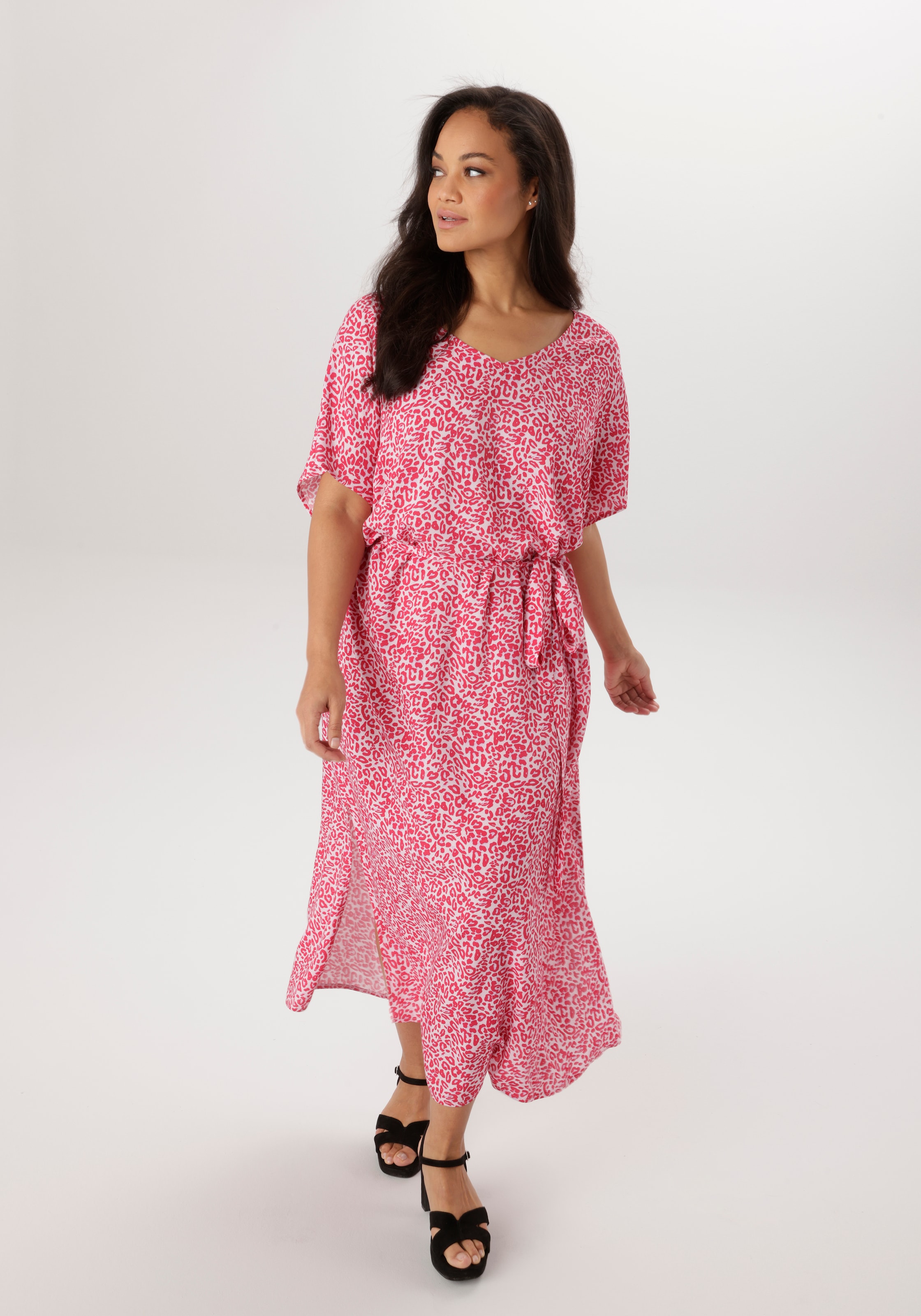 Bezauberndes Kleid von Aniston PLUS. In farbenfrohen Safariprint. Dekorativer V-Ausschnitt, 3/4 langen Ärmeln und abgerundeter Saum. Lässig geschnittenes Blusenkleid. Länge in Gr. 46 ca. 103 cm. Aus weich fallender Viskose. Maschinenwäsche