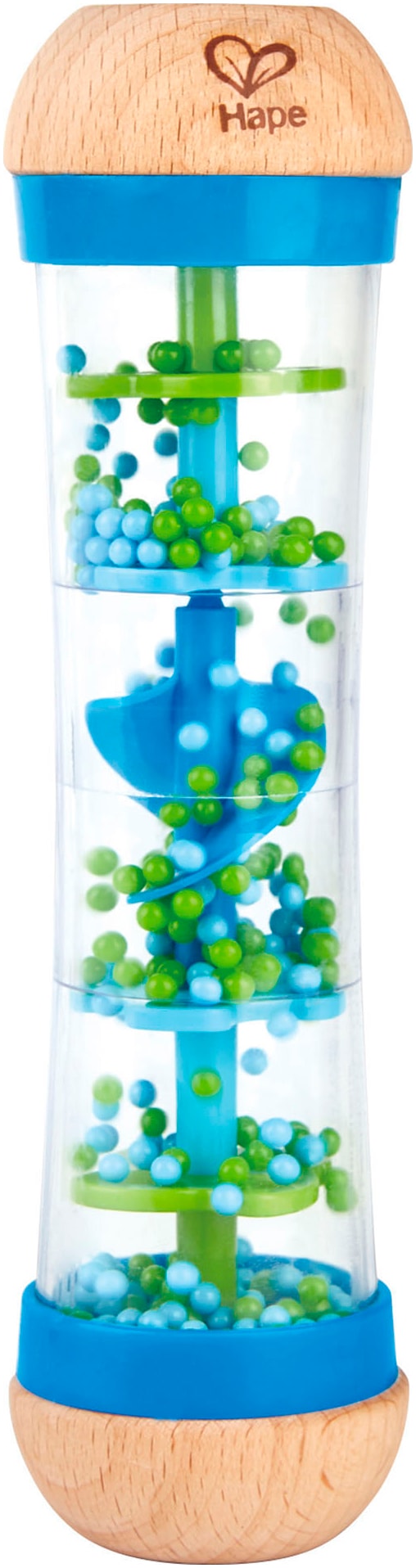 Drehen Sie den Regenmacher hin und her. Die Perlen machen Geräusche wie Regentropfen. Durch die anatomische Form können auch Kleinkinder den Regenmacher gut halten.