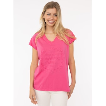 Besondere Merkmale | ausgefranste Kanten, V-Ausschnitt mit Neonkante, kurzarm, Stempeldruck |