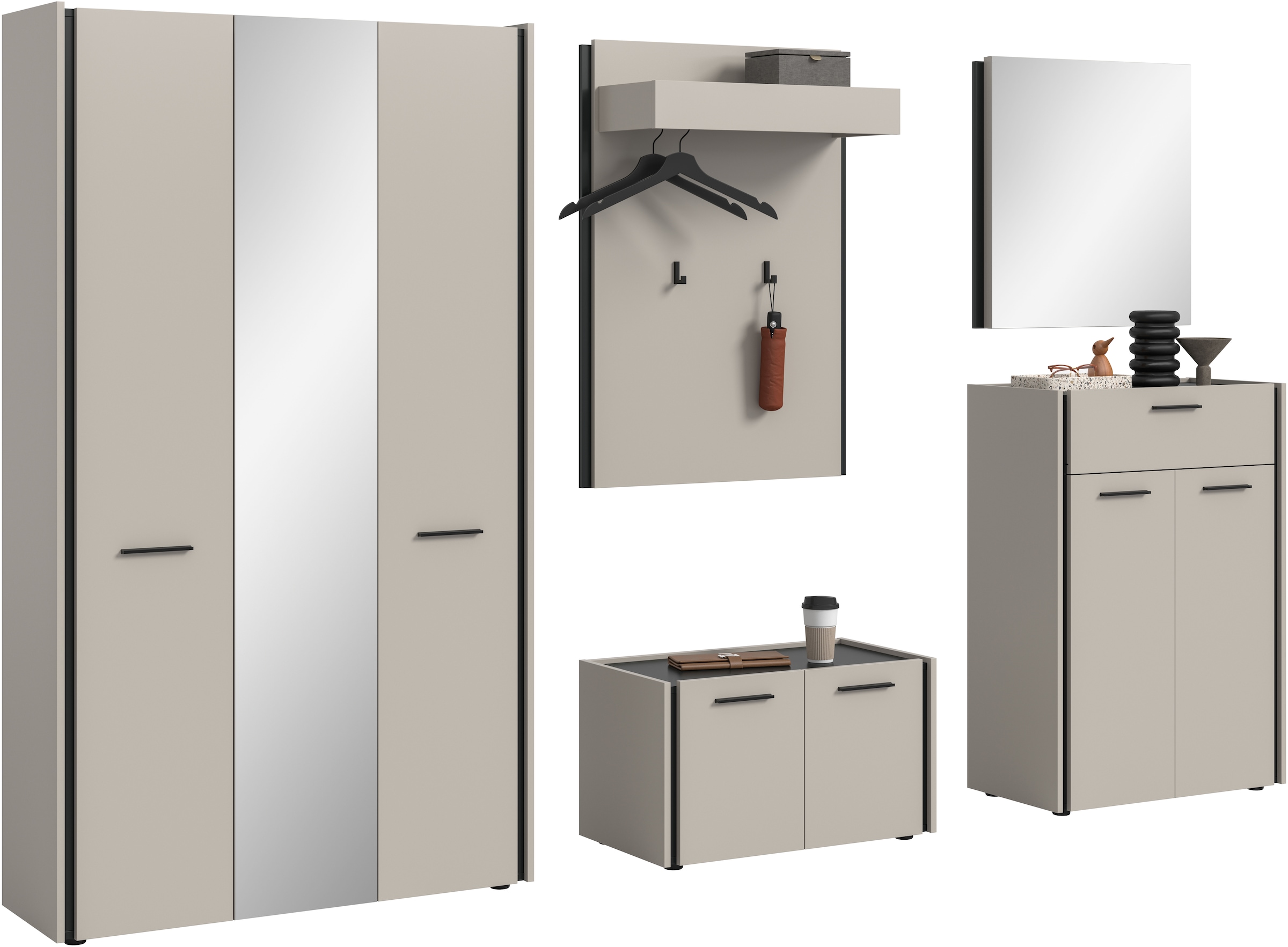 Set beinhaltet | 1x Garderobenschrank, 1x Sitzbank, 1x Garderobenpaneel |