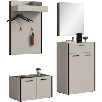 Set beinhaltet | 1x Schuhkommode, 1x Spiegel, 2x Hakenpaneel |
