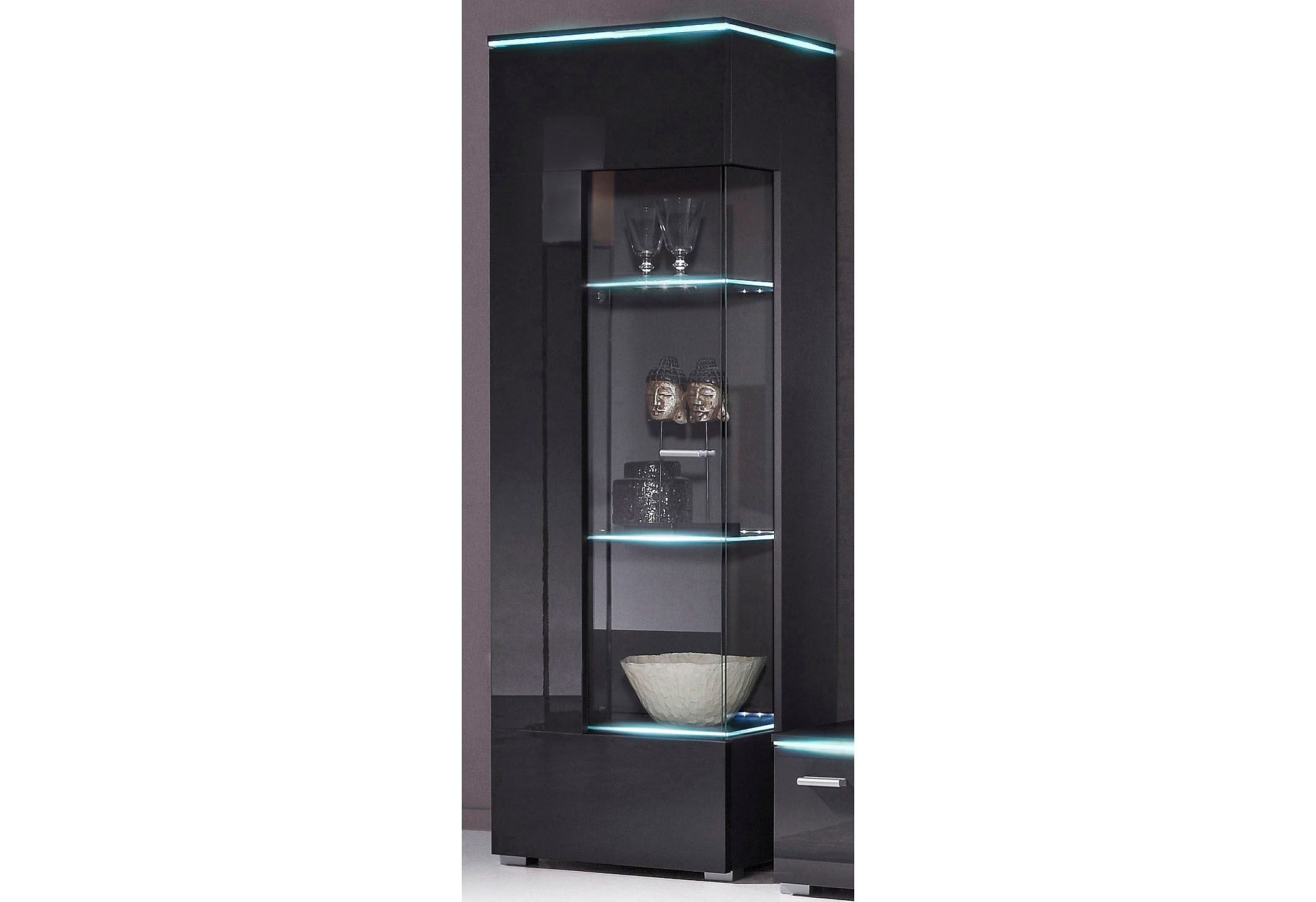 Wissenswertes | Beleuchtung bitte extra bestellen. Wir empfehlen für die Vitrine 1x 5er Set LED-Glaskantenbeleuchtung in blau (Artikelnummer: 824195) oder in weiss (Artikelnummer: 800527). Inkl. Trafo und Zuleitung. |