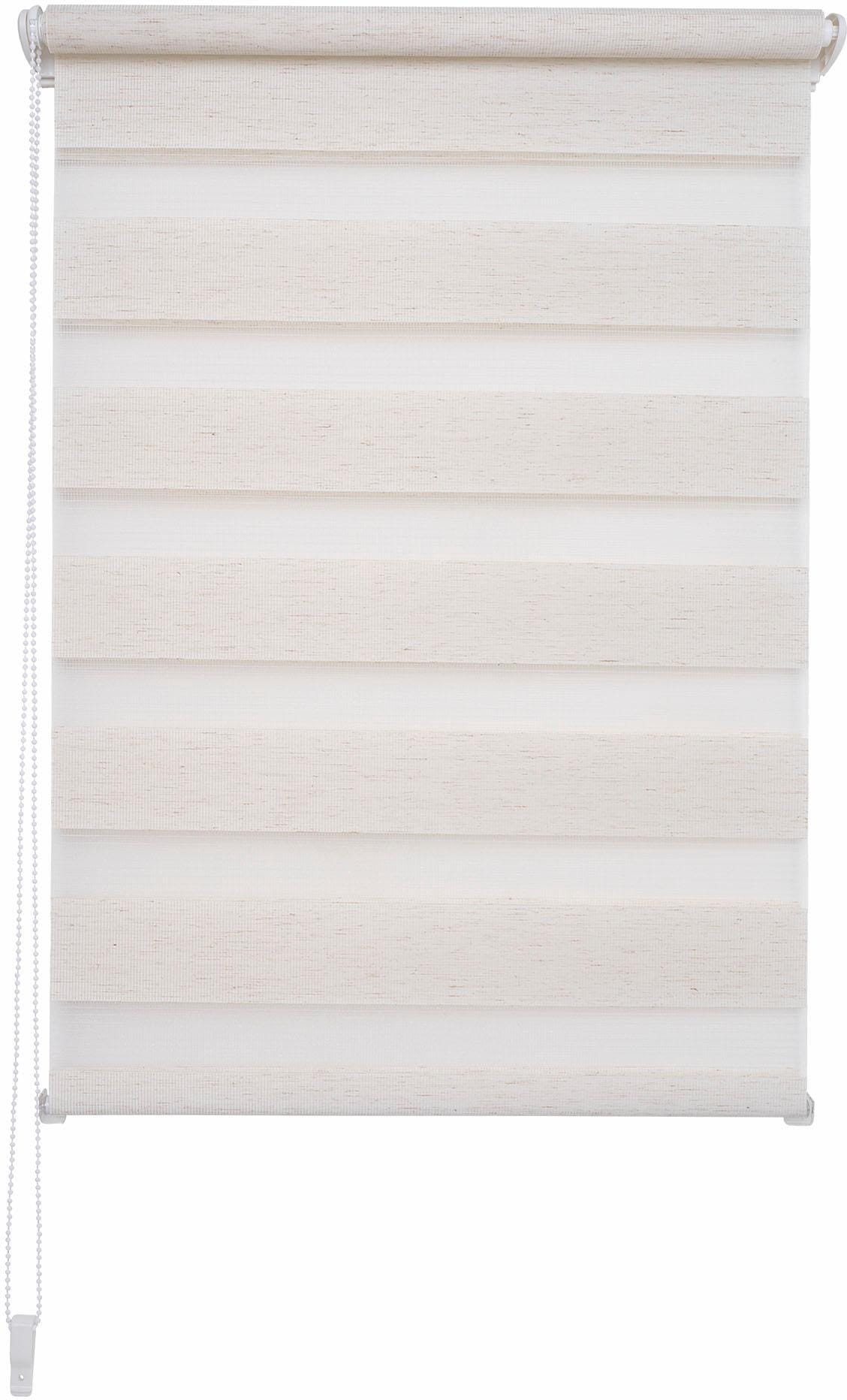 Doppelrollo von »Liedeco« im Festmass. Mit dem trendigen Doppelrollo können Sie individuell die Lichtverhältnisse in Ihren Wohnräumen regulieren. Der Stoff ist abwechseld in transparenten und blickdichten Streifensegmenten gewebt und verläuft doppelt gegeneinander. Durch diese Technik lassen sich vielfältige Lichteinwirkungen über den rechts positionierten Kettenzug steuern: von Durchsicht zu leichter Transparenz bis hin zu Sicht- und Lichtschutz. Die vormontierte Kopfschiene aus weiss beschichtetem Aluminium und mit weisser Blende wird mittels Trägern einfach auf dem oberen Fensterrahmen montiert.