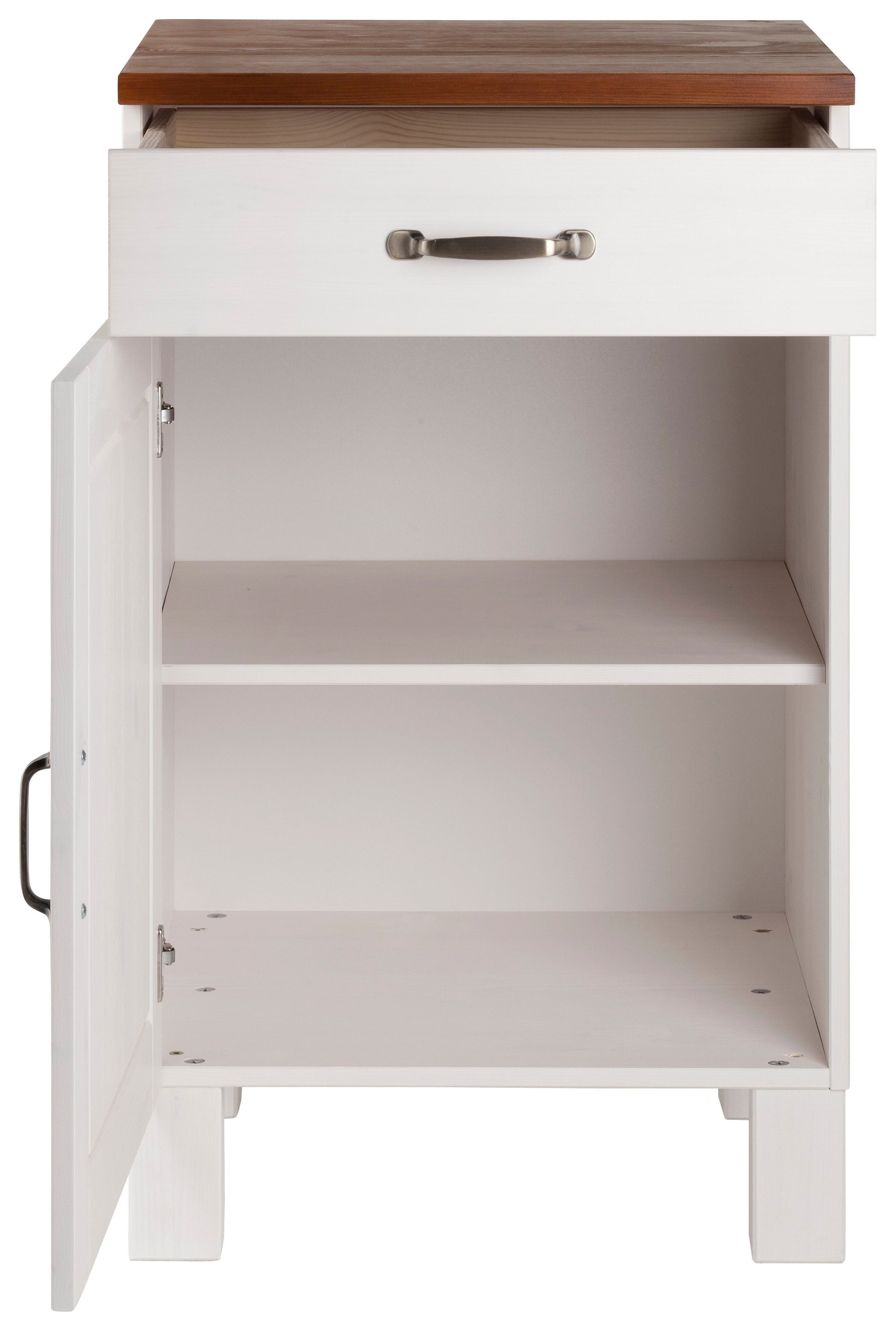 Wissenswertes | Home affaire Seit 2001 begeistert uns Home affaire mit Landhausmöbeln zum Verlieben. Ob modern, romantisch oder natürlich traditionell - der Fantasie für wunderschönes Einrichten sind kaum Grenzen gesetzt. Frische Impulse in der Küche: Der optisch ansprechende Unterschrank »Alby« punktet durch sein attraktives Design im Landhausstil. Arbeitsplatte und Korpus sind komplett aus massiver Kiefer gefertigt, das verwendete Holz stammt aus vorbildlich bewirtschafteten Wäldern und ist FSC®-zertifiziert. Der Schrank ist in unterschiedlichen Farbgebungen erhältlich, somit können individuelle Geschmacksvorlieben bei dem Kauf dieses Qualitätsprodukts berücksichtigt werden. Der Küchenschrank verfügt über eine Schublade und zwei Schrankfächer, die durch einen herausnehmbaren Einlegeboden unterteilt sind. Schublade wie auch Schranktür lassen sich anhand dekorativer Metallgriffe öffnen und schliessen und runden das gelungene Design ab. Der Unterschrank »Alby« schafft ein gemütliches Wohnambie |