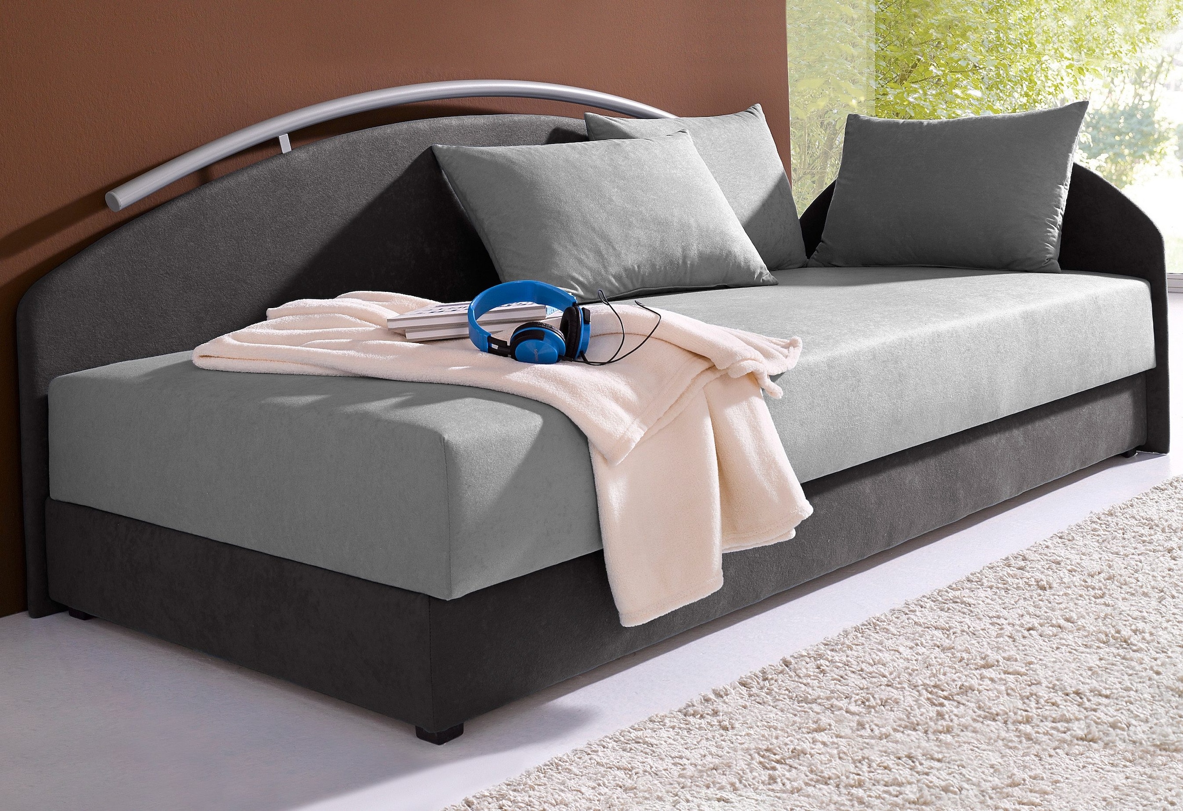 Wissenswertes | Mit Seitenteil und Metall-Reling am Rückenteil. Seiten- und Rückenteil sowie Metall-Reling gerundet. Das Seitenteil ist wahlweise rechts oder links montierbar. Bezogen mit pflegeleichter Microfaser (100% Polyester). Seitenteilhöhe ca. 67 cm, Rückenteilhöhe ca. 81 cm. In 2 Breiten und