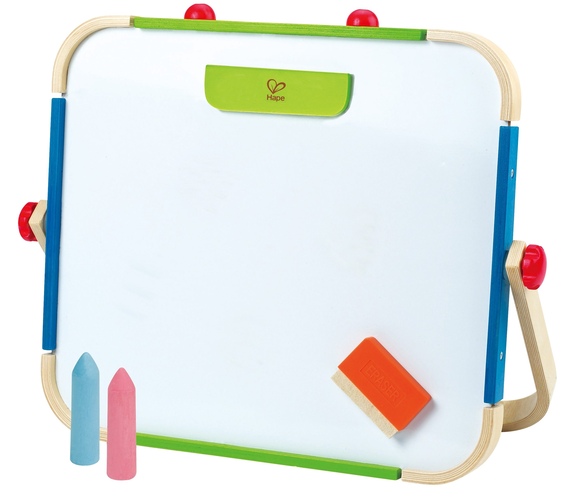 Das mobile Tisch-Atelier ermöglicht kleinen Künstlern sich ihre eigenen Kunstwerke zu erschaffen. Ob zu Hause oder für unterwegs das Atelier ist immer eine willkommene Abwechslung für kleine Kinder. Die Tafel kann beidseitig benutzt werden. Die dunkle Seite zum Bemalen und Schreiben mit Kreide, die weisse Seite hingegen ist ein Whiteboard. Magnetische Formen dienen zum Festmachen des Malpapiers und gegebenenfalls auch als Schwamm für das Whiteboard.
