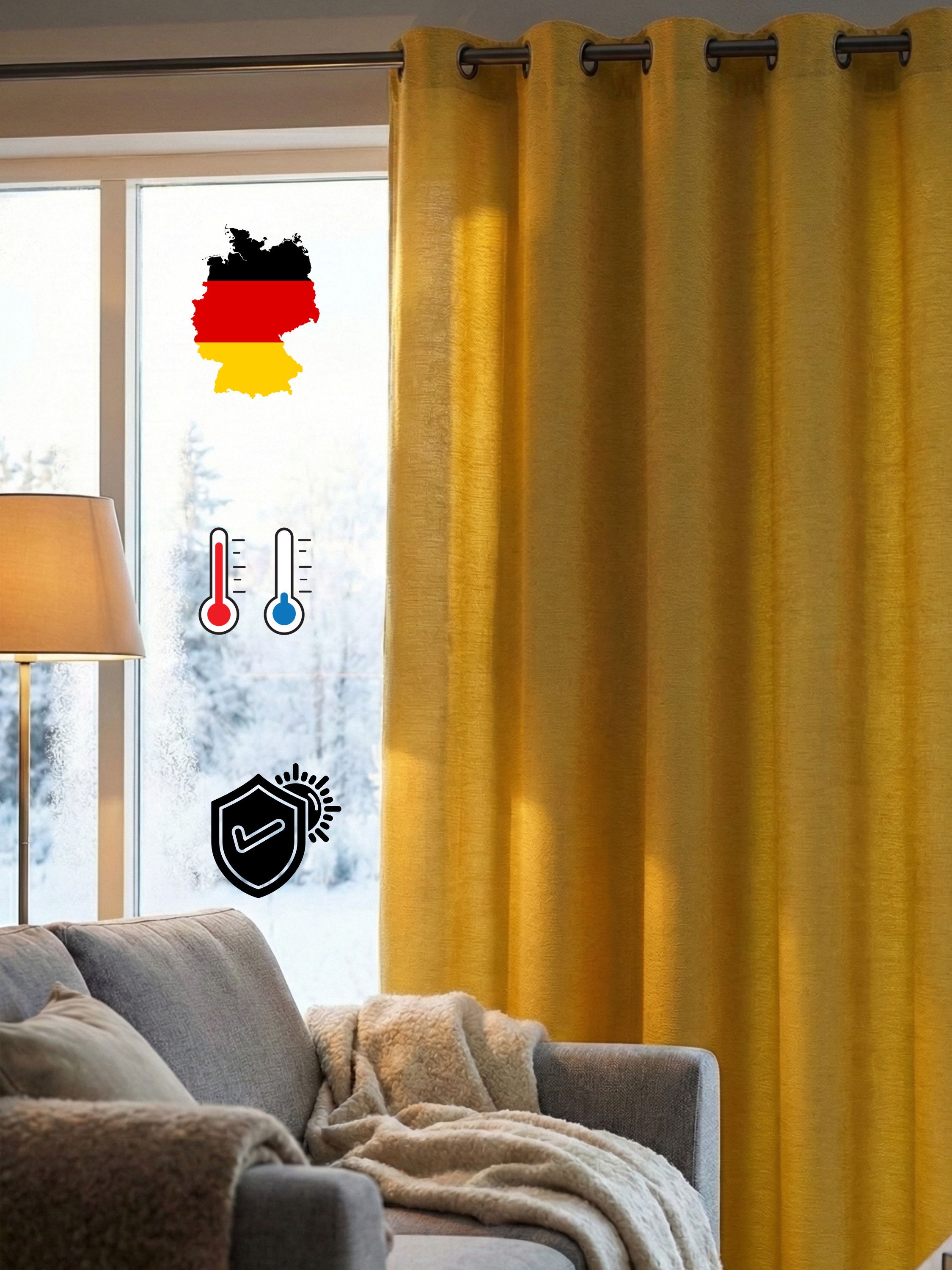 Hinweis Materialart | Chenillequalität bezeichnet einen Vorhangstoff, der aus voluminösem Garn gewebt wird. Das schwere Gewebe mit samtiger Oberfläche bietet sowohl Kälte- als auch Lärmschutz. |