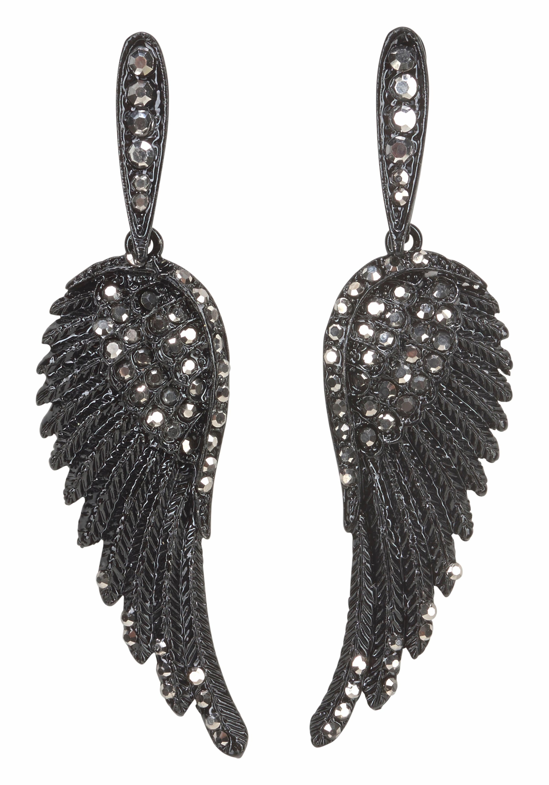 Zum Abheben schön sind die langen Ohrstecker. Die angesagten Ohrringe sind durch ihre Anhänger in Flügelform modisch ganz vorn dabei. Noch glamouröser werden die Accessoires durch den teilweisen Besatz mit funkelnden Glitzersteinen. Ein unauffälliger Steckverschluss fixiert die Ohrhänger. Die Ohrringe verleihen selbst schlichten Outfits aus Jeans und Shirt eine extra Portion Style