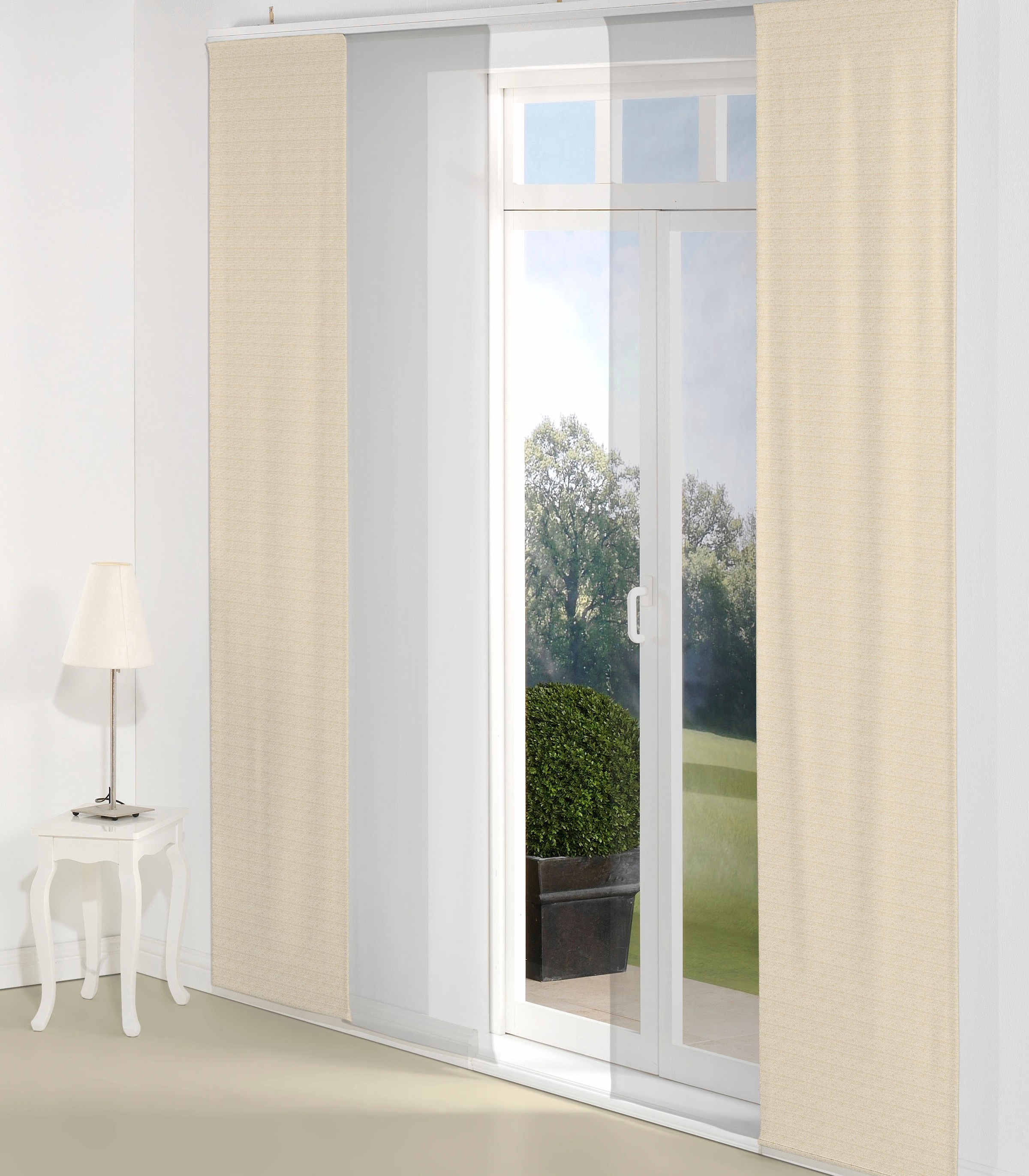 Hinweis Dekoration | Die angegebenen Masse sind die fertig dekorierten Masse.;Eine Schiebegardine ist eine schmale, glatt hängende Stoffbahn, die sich sowohl als Sichtschutz als auch zur Raumteilung eignet. Durch die Schiebetechnik sind Schiebegardinen sehr flexibel einsetzbar. |