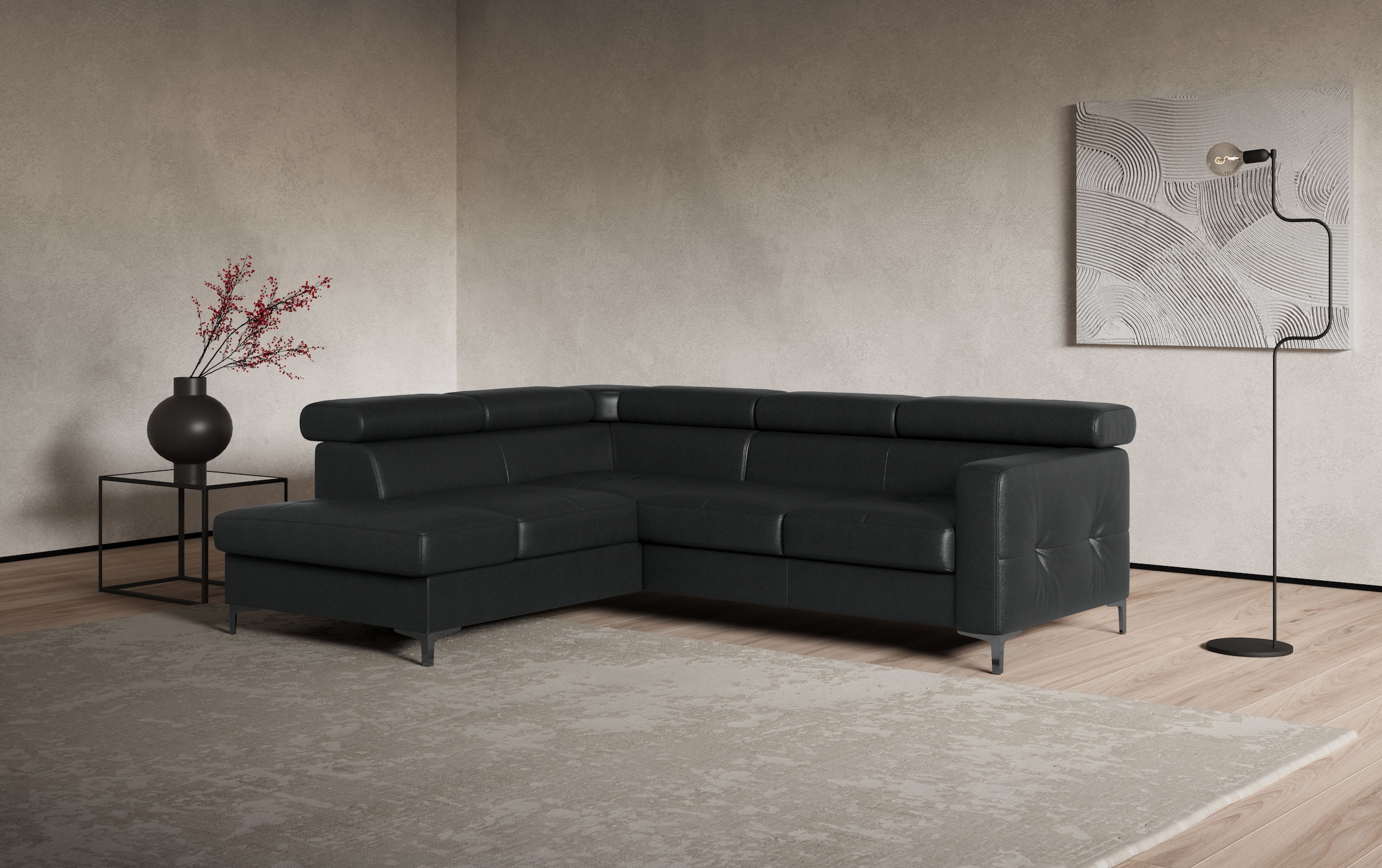 Elegantes Polsterprogramm, bei dem keine Wünsche offen bleiben! Mit Kopfstützen-Höhenverstellung. Wahlweise auch mit Bettfunktion. Mit stabilem Holzuntergestell, atmungsaktiver Polyätherschaum-Polsterung und komfortabler Wellenunterfederung.