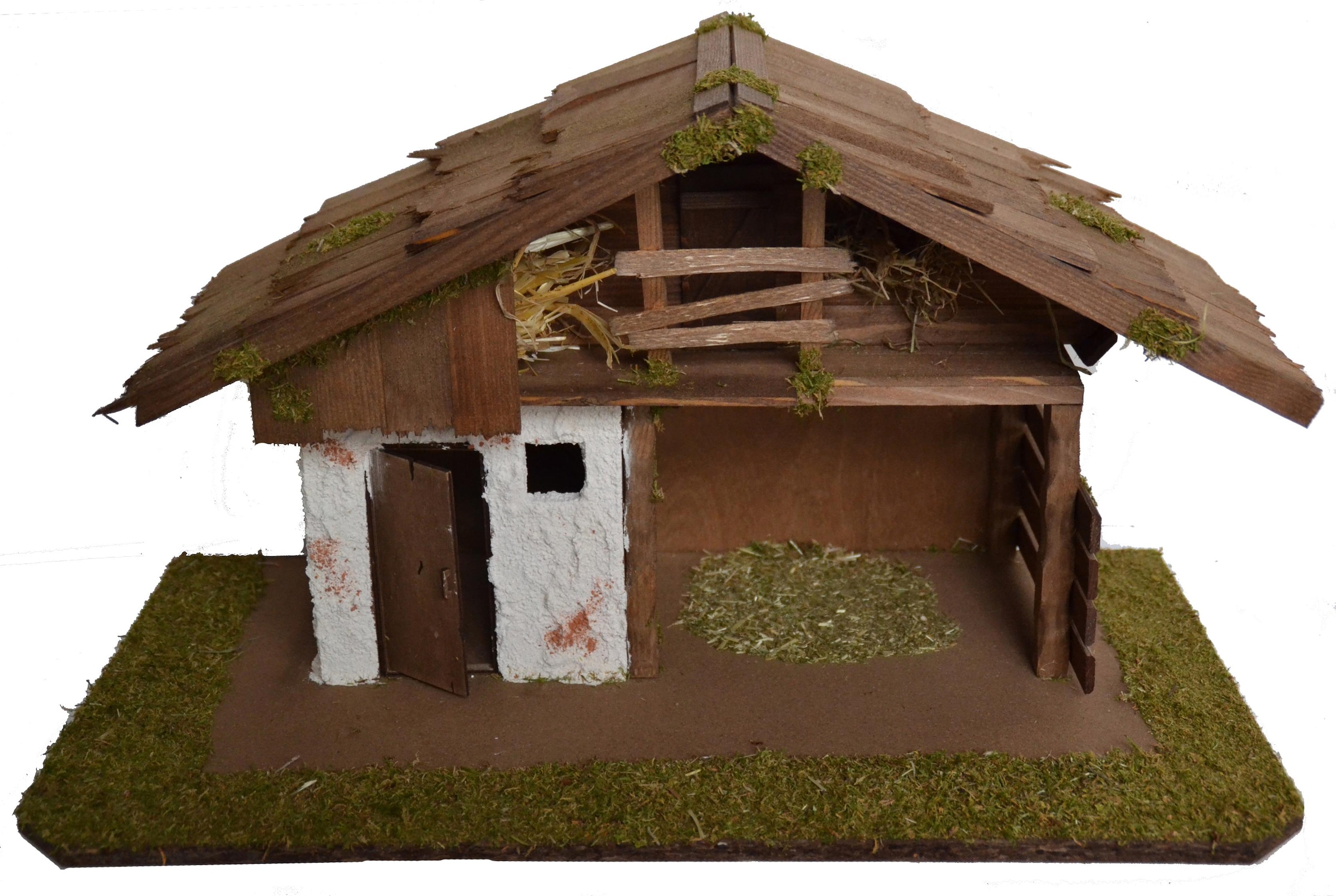 Diese Krippe wurde aus echtem Holz mit vielen Details gebaut. Der rechte Bereich bietet Platz für die Hl. Familie, Ochs und Esel sowie noch für weitere Figuren. Das Dach wurde mit Schindeln gedeckt und der gesamte Krippenstall ist mit Moos, Stroh und Heu dekoriert. Die Krippe ist für Krippenfiguren mit einer Höhe bis 12cm besonders gut geeignet.
