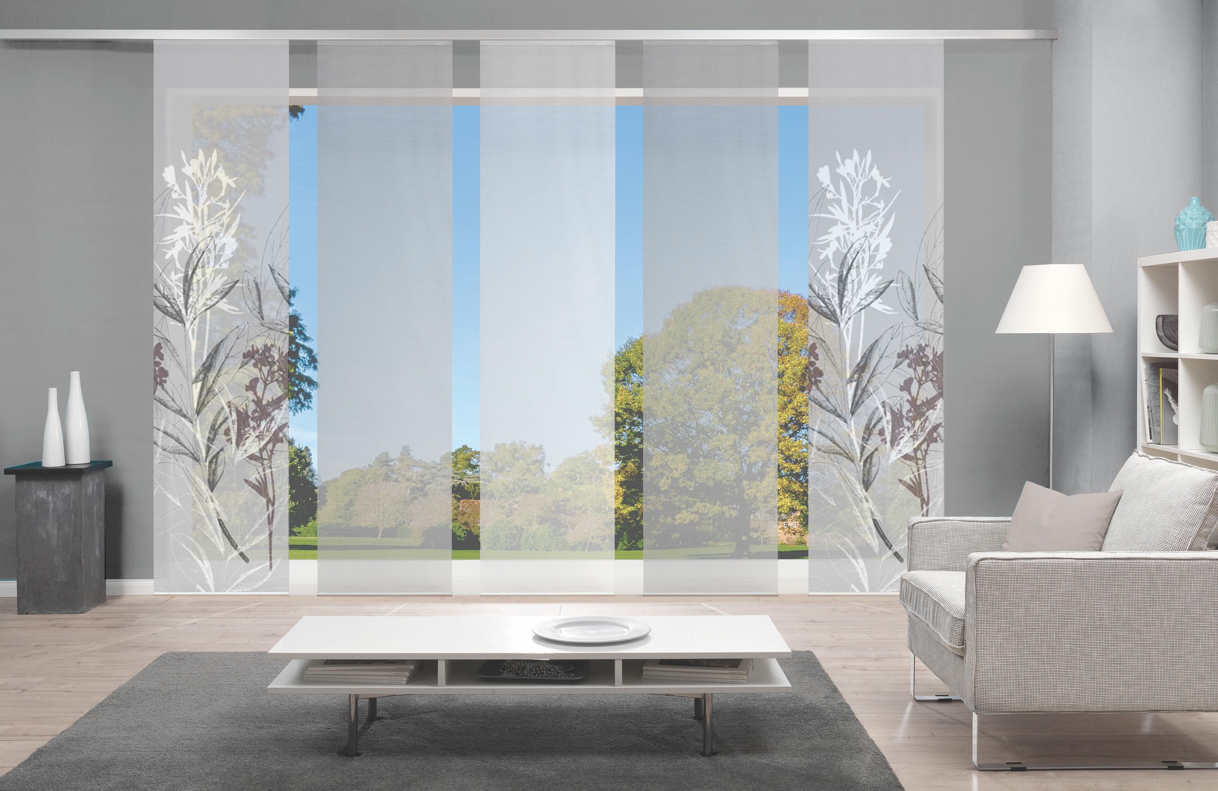 Hinweis Dekoration | Die angegebenen Masse sind die fertig dekorierten Masse.;Eine Schiebegardine ist eine schmale, glatt hängende Stoffbahn, die sich sowohl als Sichtschutz als auch zur Raumteilung eignet. Durch die Schiebetechnik sind Schiebegardinen sehr flexibel einsetzbar. |