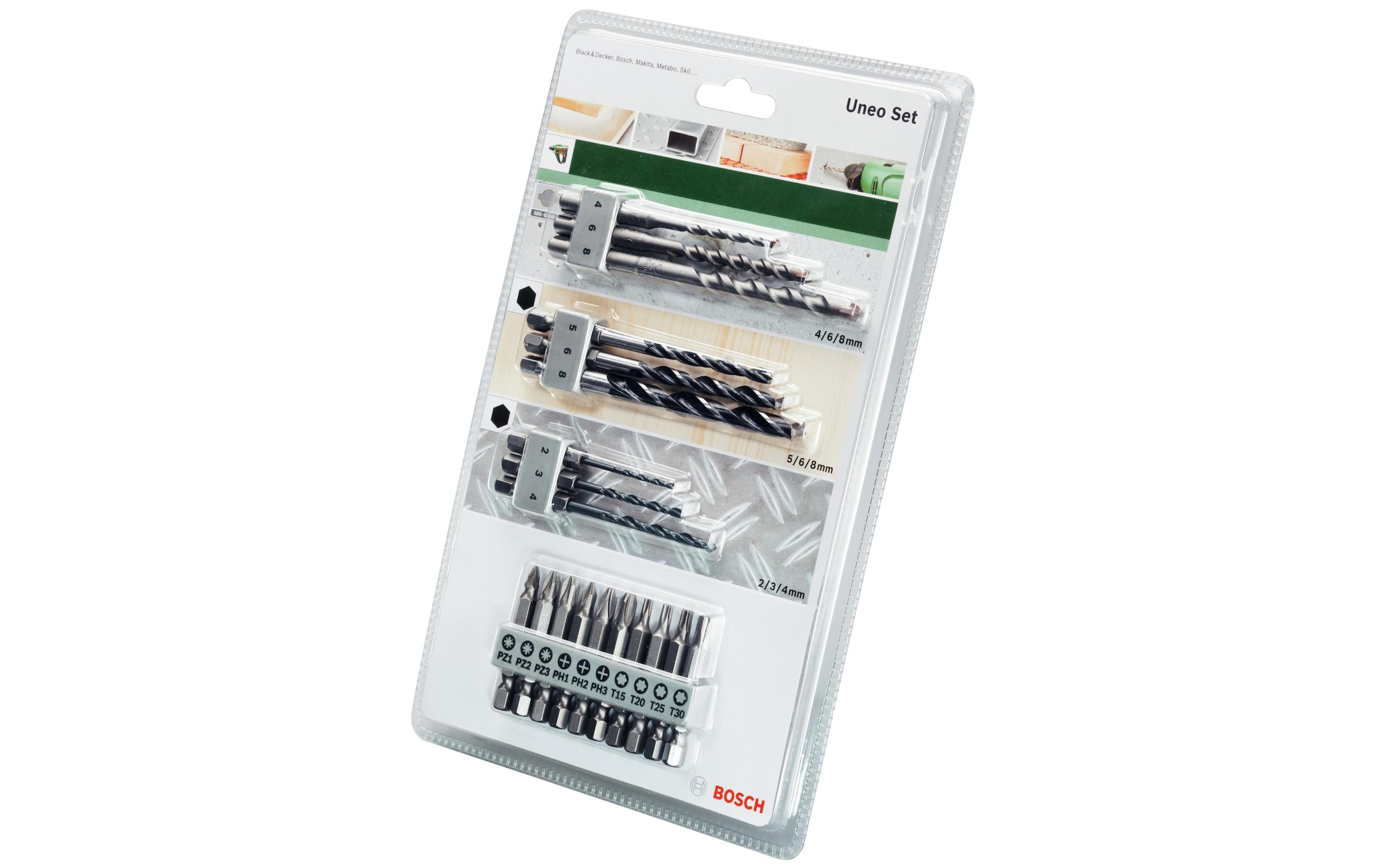 - Enthält Stein-, Holz- und Metallbohrer sowie Schrauberbits