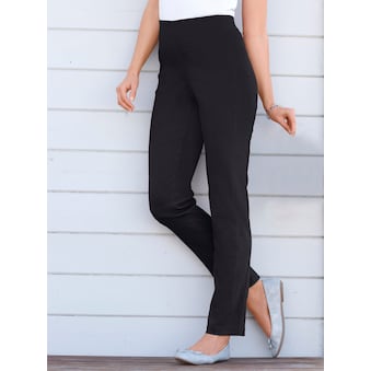 Hose mit hohem Rundum-Dehnbund: Der ist nicht nur wunderbar bequem, sondern schummelt auch geschickt Pölsterchen am Bauch weg! Mit Reissverschluss-Blende und 2 imitierten Taschen vorne. 2 aufgesetzte Gesässtaschen. Fussweite ca. 36 cm. Unterstützt die Initiative Cotton made in Africa. 65% Baumwolle, 33% Polyester, 2% Elasthan. Maschinenwäsche.