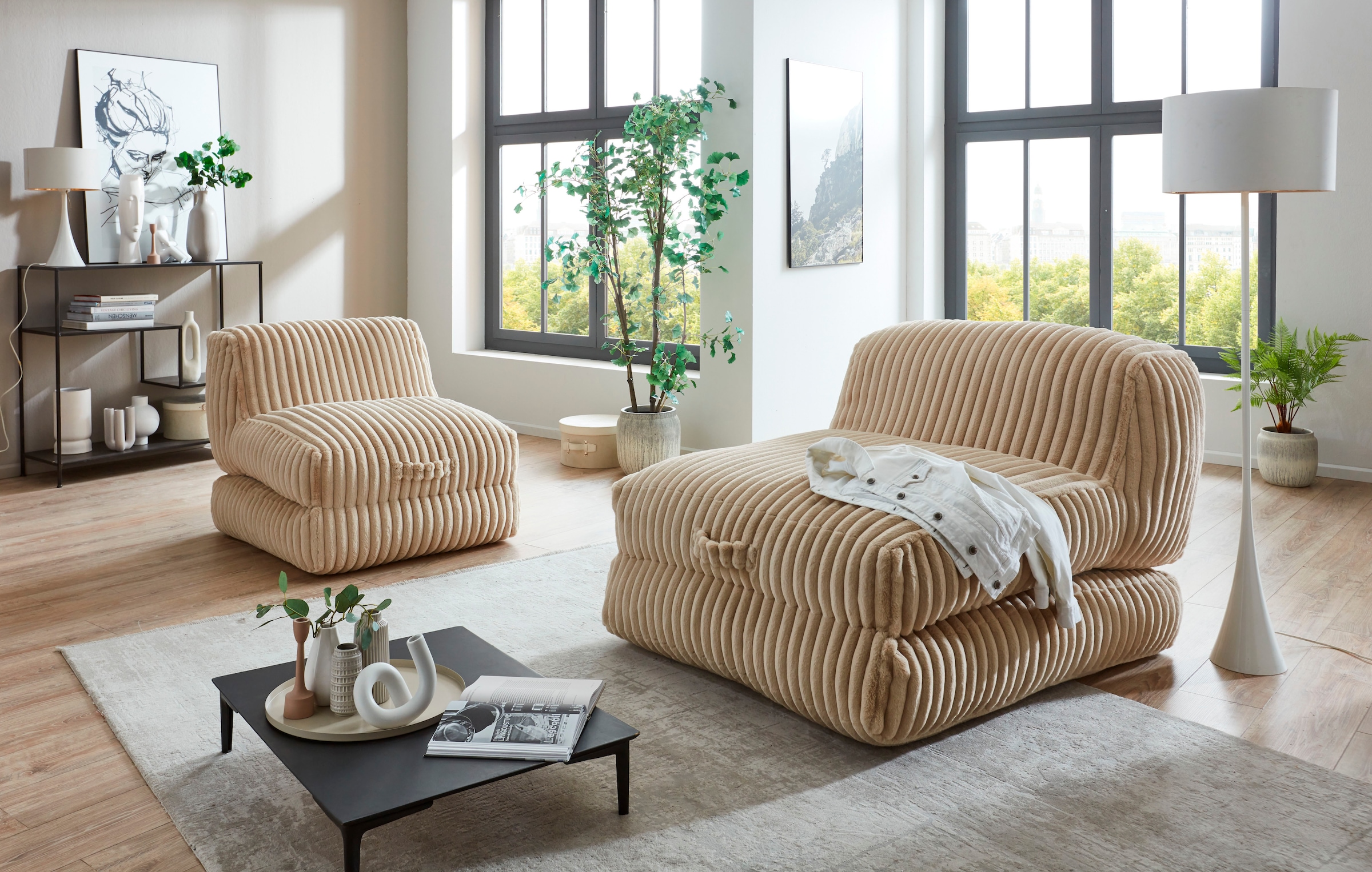 Eine Alternative zu beiden Varianten ist der Relaxsessel mit passender Fussbank: Sie legen locker die Füsse hoch und können beide Teile auch separat nutzen, etwa wenn Sie bei Besuch zusätzliche Sitzgelegenheiten schaffen möchten. Ist die Rückseite des Sessels bezogen, können Sie ihn auch frei in den Raum stellen und ihn somit als Blickfang verwenden.